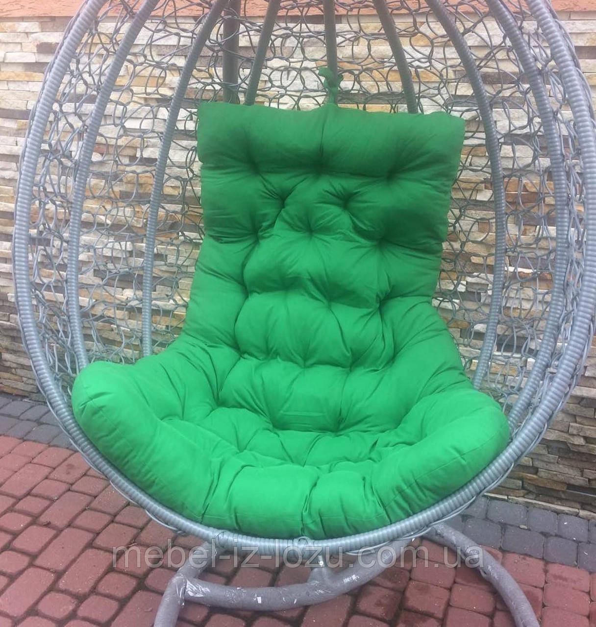 Крісло-кокон із ротанга, сірий з зеленою подушкою
